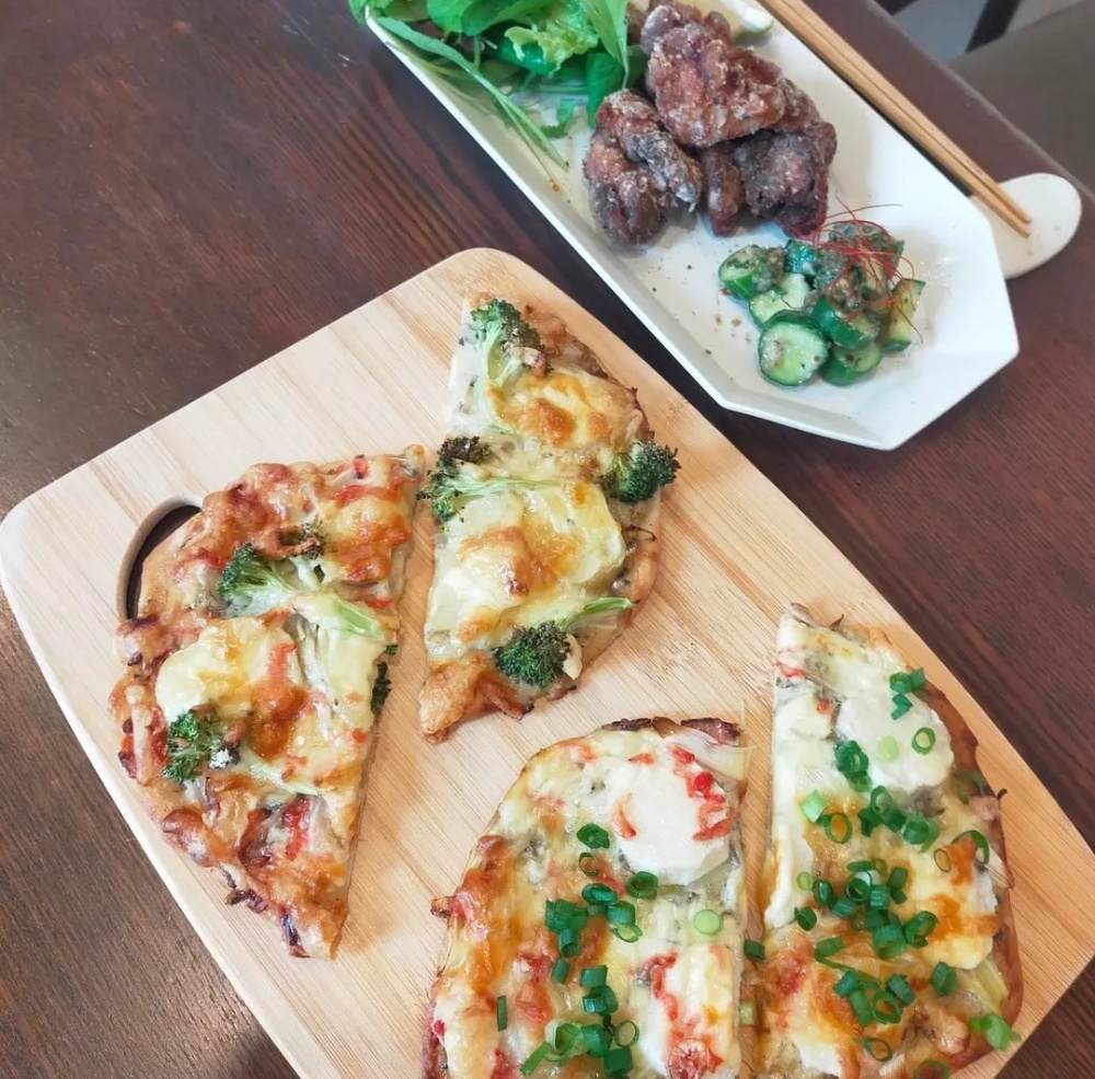 今日は、粉末出汁を使ったソースをベースに野菜などたっぷりの和風ピザに😊